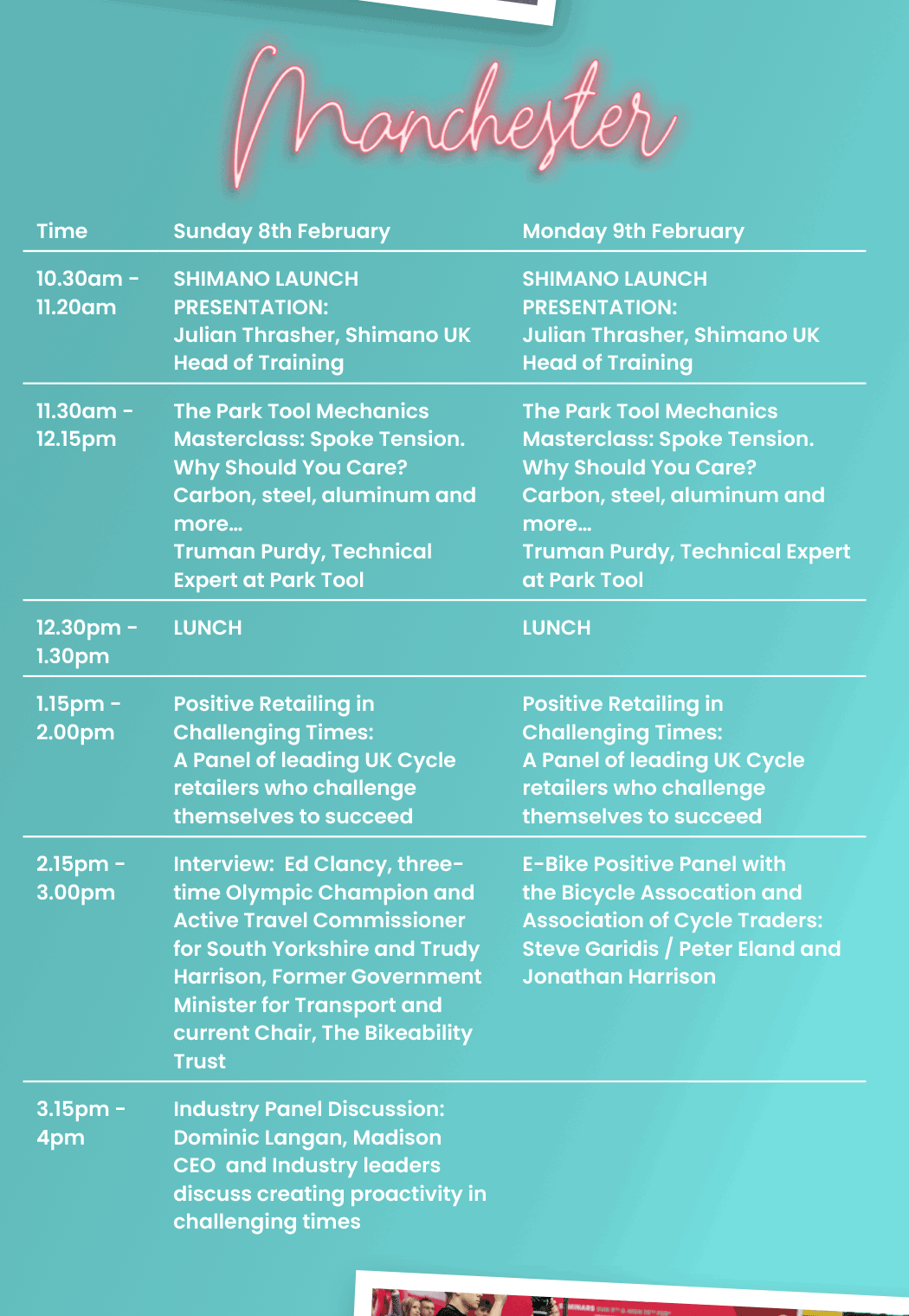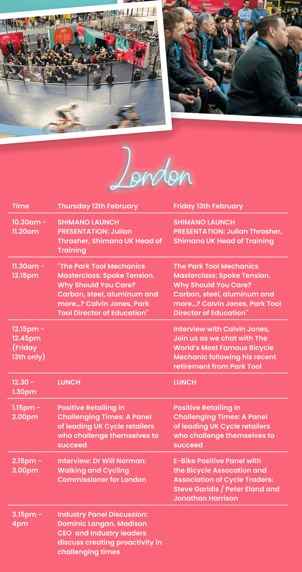 It is a star-studded line-up across the two venues with the likes of Ed Clancy, Trudy Harrison, Calvin Jones, Dr Will Norman, Dominic Langan, Julian Thrasher and more being involved in talks, interviews or panel discussions. See the table for the full schedule and a summary of what is entailed below.